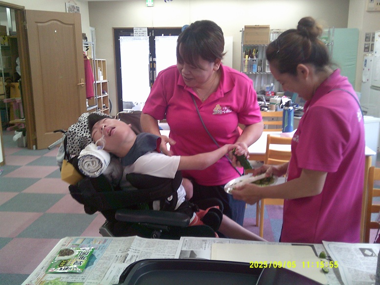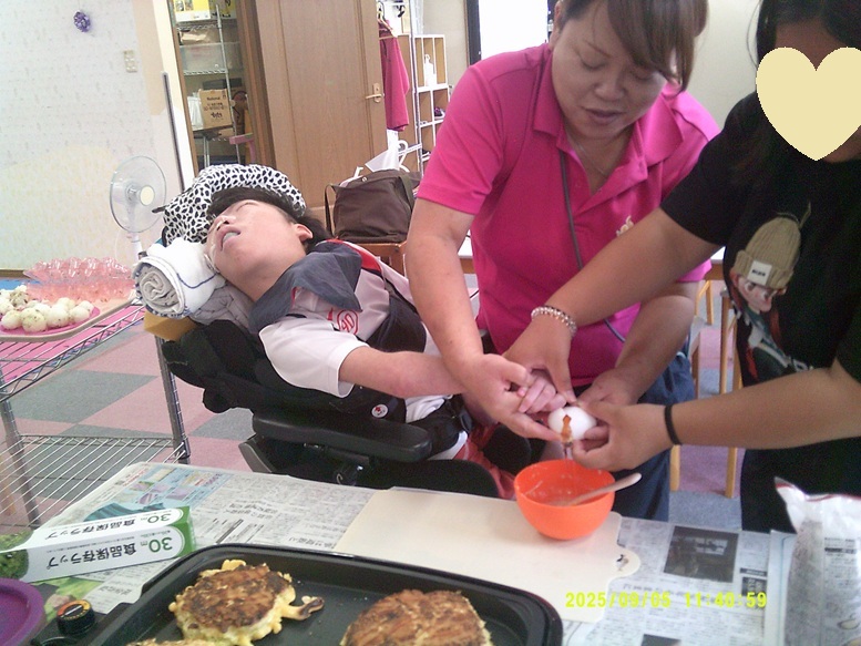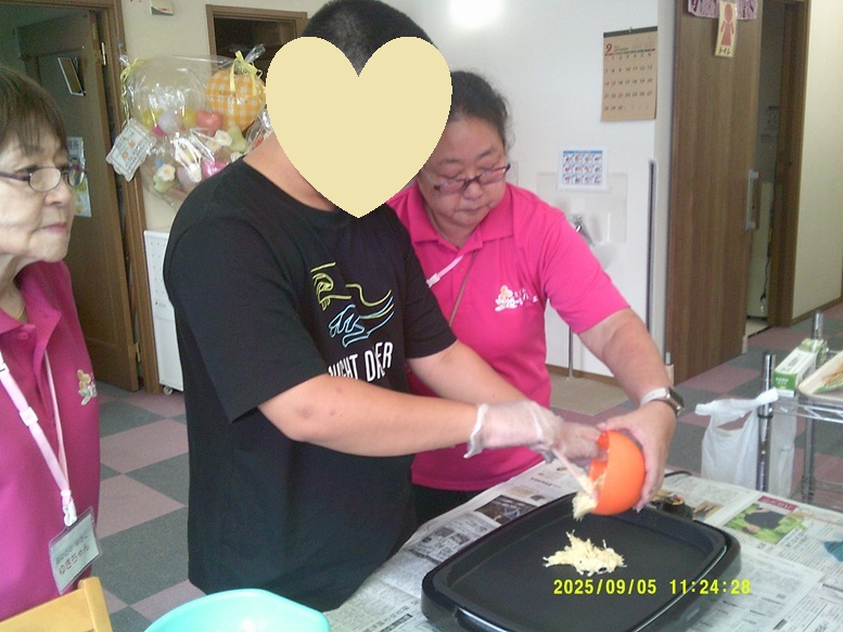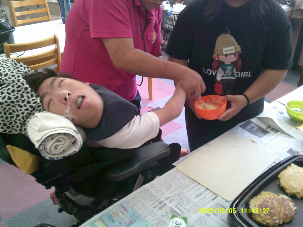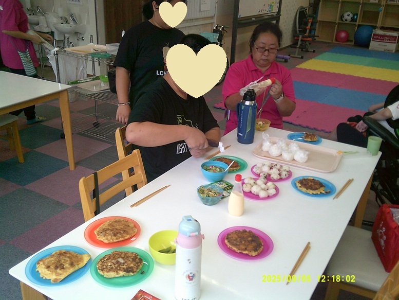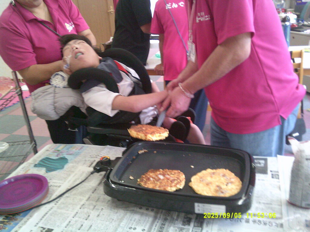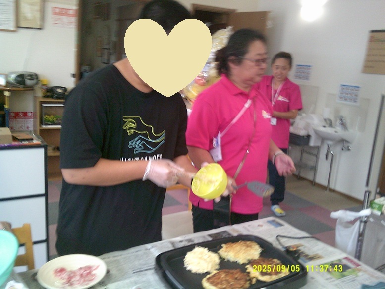 お知らせ パニエで初のクッキング 2025.10.17 7月オープンの「フローレットパニエ」現在利用してくれている方が2名とまだまだ寂しいですが、初クッキングと言う事で「お好み焼」「おにぎり」「胡瓜の和え物」を作りました。Y君とR君頑張ってくれました。もちろんお味は・・・GOOD👍でした Digital Camera Digital Camera Digital Camera Digital Camera Digital Camera Digital Camera Digital Camera