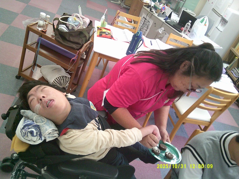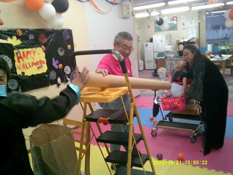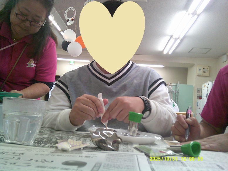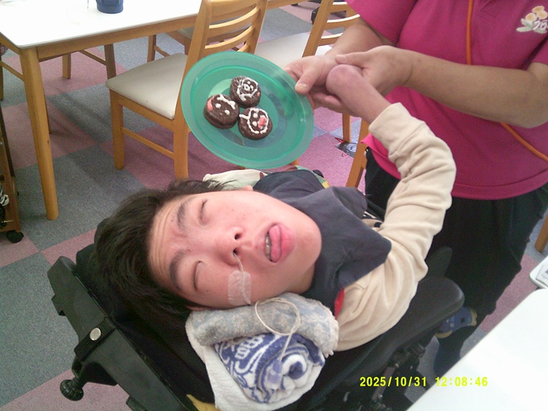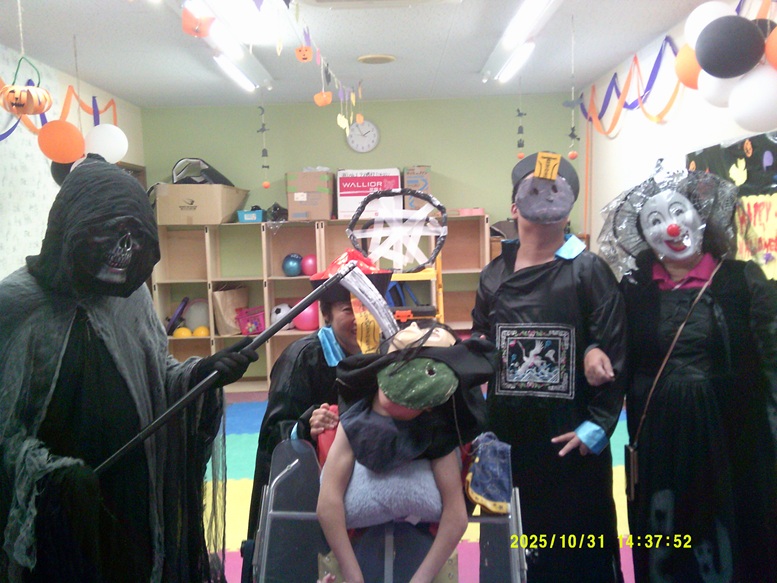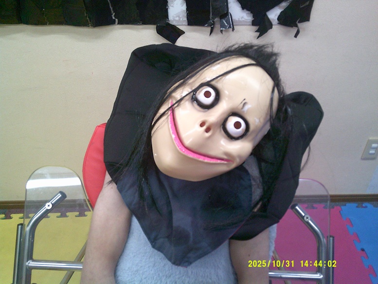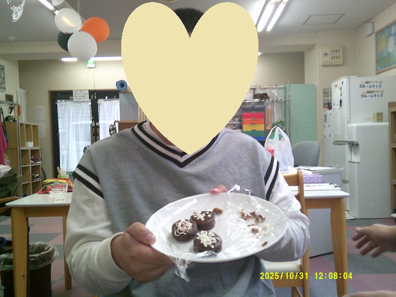 利用者2名ではありましたが、楽しいハロウィンイベントを開催しました。午前はチョコパイにチョコペンで絵を描き「おやつ」に、午後は仮装とゲーム大会。何故かスタッフの方が盛り上がってました( *´艸`)